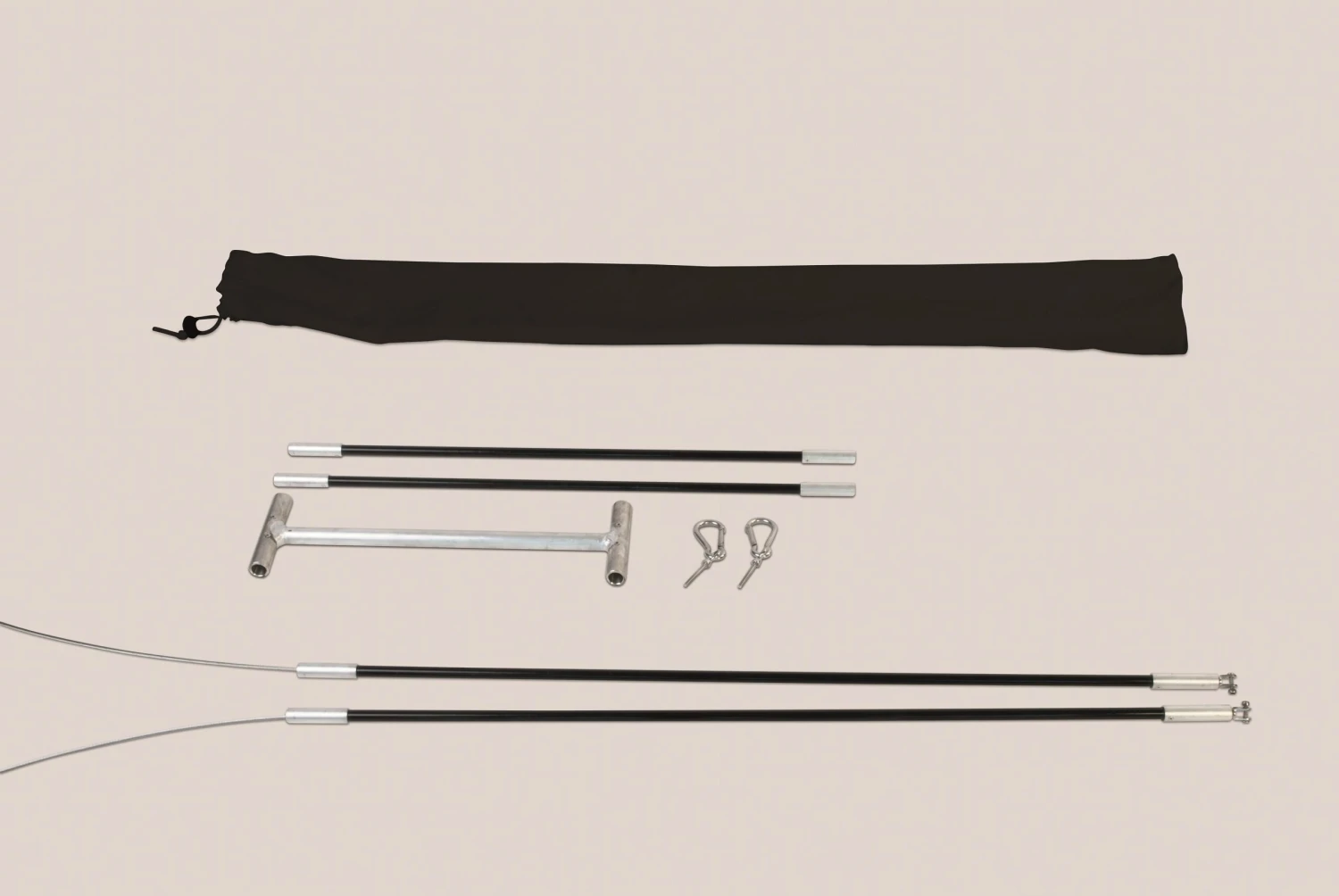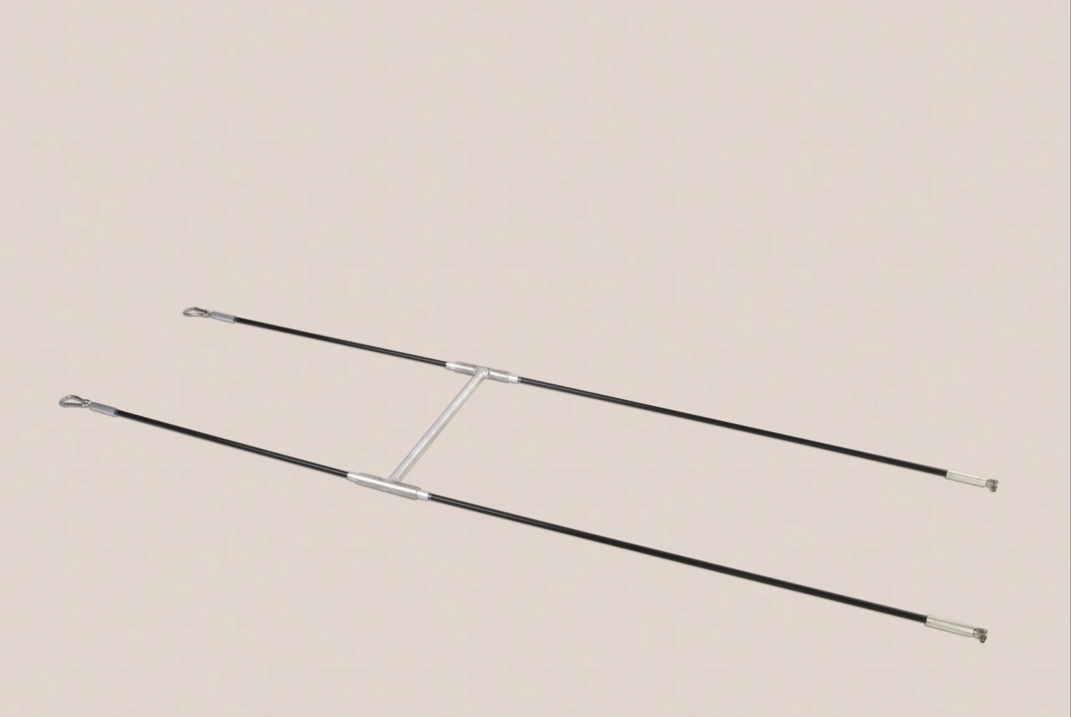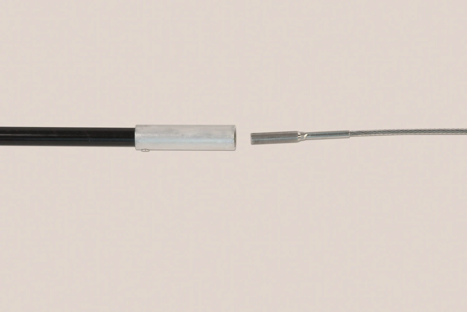 - Glassfiberrør med aluhylse settes over en wire med terminaler, låses med øyebolt